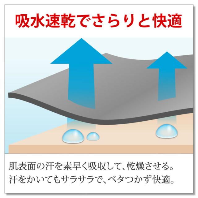 吸汗速乾性も高く、肌表面の汗を素早く吸収、拡散して乾燥させる。