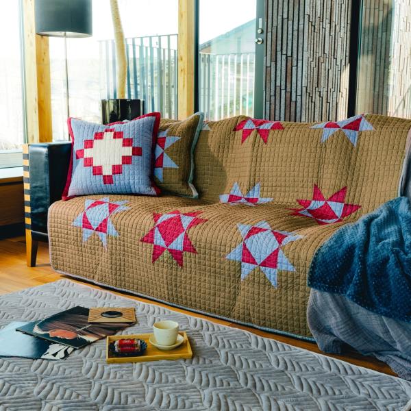 一針ずつ丁寧にハンドメイドで繋ぎ合わせた大判のパッチワークキルトになります。