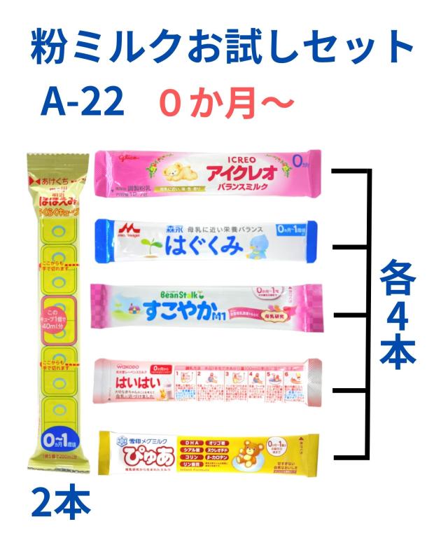 内容量 【タイプA-22本入り】 ・ほほえみ らくらくキューブ (200ml分) × 2本 ・アイクレオ スティック (100ml分) × 4本 ・すこやか スティック (100ml分) × 4本 ・はいはい スティック (100ml分) × 4本 ・はぐくみ スティック (100ml分) × 4本 ・ぴゅあ スティック (100ml分) × 4本 【年齢】
