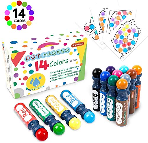 Shuttle Art ドットマーカー ウォッシャブルカラーペン 水性 14色セット 洗える 塗り絵付き 絵かき 画用紙 40ml 子供用 落書