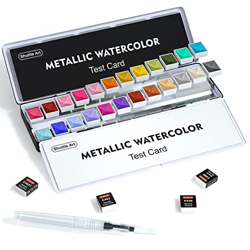 Shuttle Art 固形水彩絵の具 メタリック 24色セット 固体水彩 ハーフパン 鮮やか 金属色 パレート 水筆ペン 画用紙付き 透明 パ