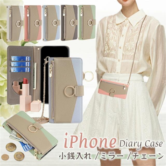 ミラー付き iPhone17 air 16e スマホケース手帳型 チェーン型 ショルダー ストラップ iphone16 15pro 14 13 12 11 pro max SE4 SE2 SE3 XS XR 8 7 携帯ケース iPhone14 iPhone13 iPhone12 手帳型ケース スマホショルダー カード収納 コインケース ポーチ付き くすみカラー