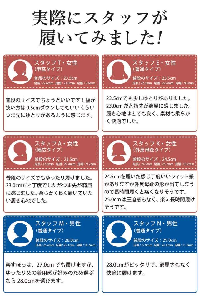 | 3E相当(ややゆったり) 【サイズ選びのポイント】 普段のサイズがおすすめです。 足の幅が狭い方、甲が低い方、ぴったりとしたフィット感が好みの方は、0.5cm小さいサイズを検討することをおすすめします。 甲高の方は普段通りのサイズがおすすめです。 厚手の靴下と合わせる場合: 冬場など厚手の靴下を履くことを想定している場合は、普段通りのサイズか、ワンサイズ上がおすすめです。 |