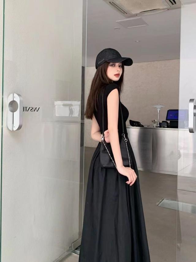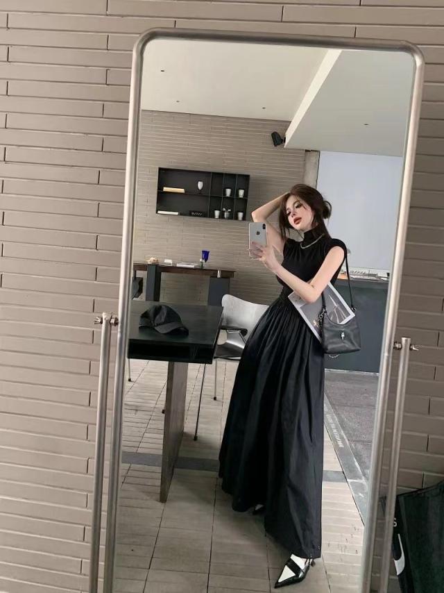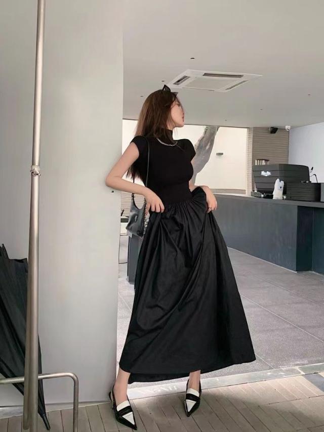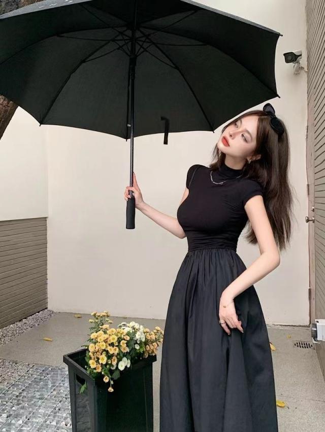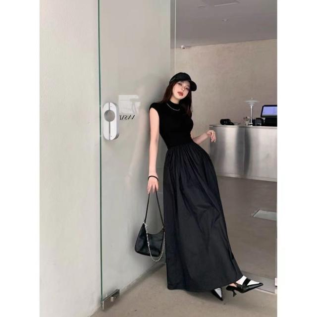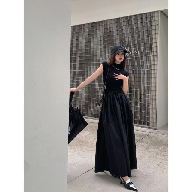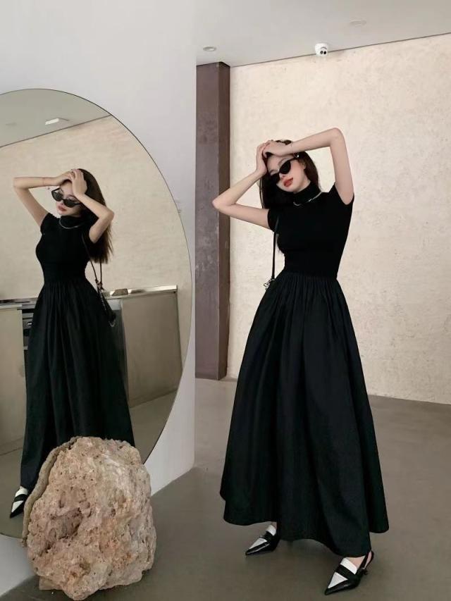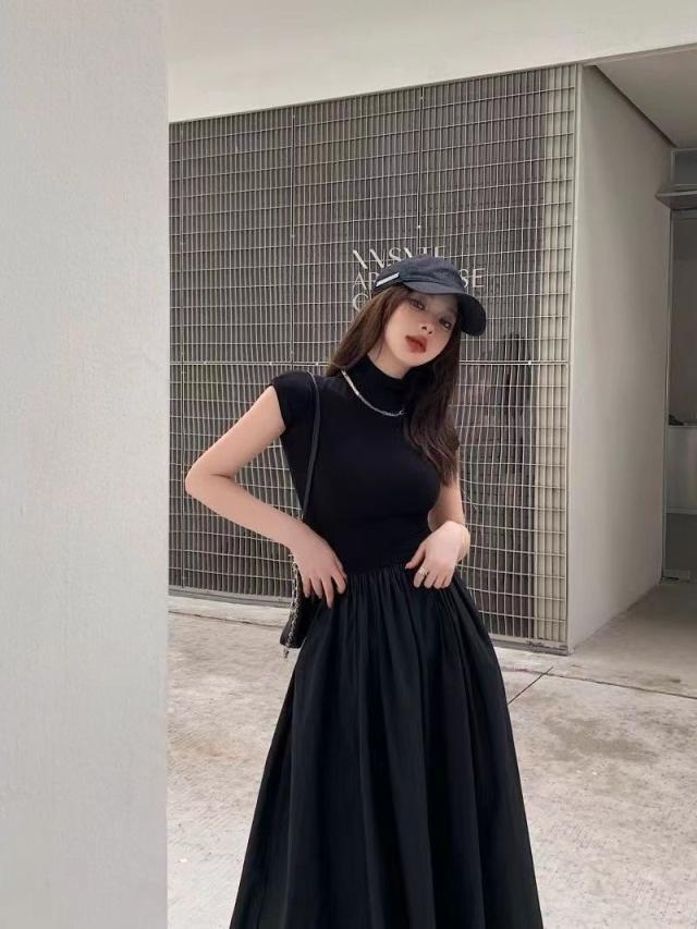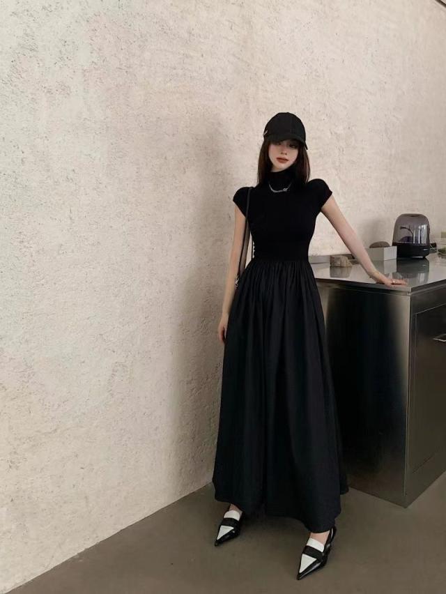 送料無料 ドッキングワンピース レディース ワンピース スタイルアップ ハイネック ウエストゴム ゆったり 体型カバー 夏 秋 ミモレ丈 ロングワンピース