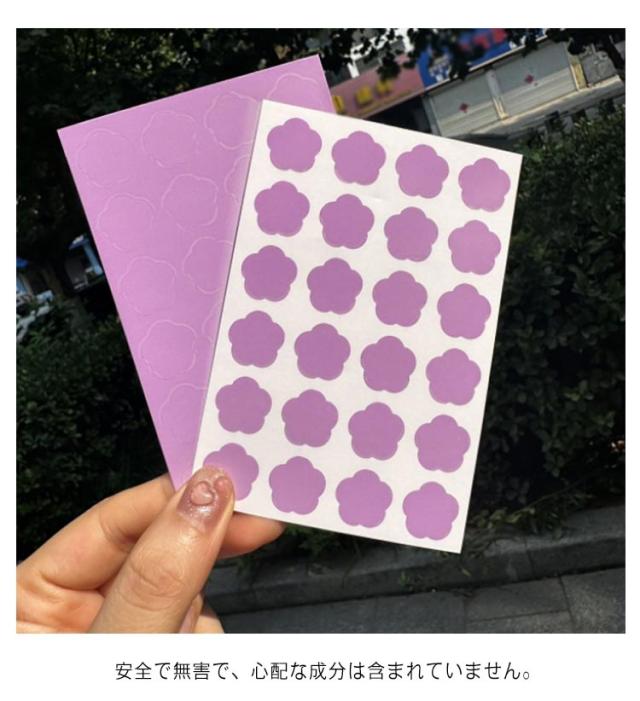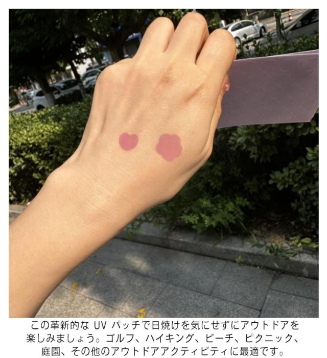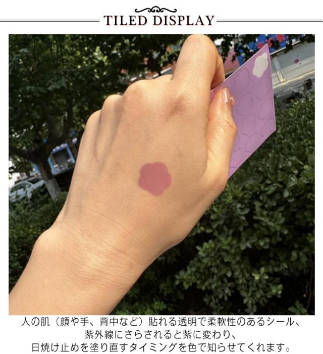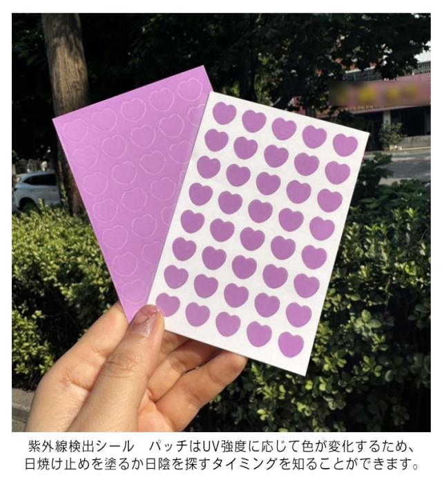 | 日焼け止めを塗り直すタイミングは一目でわかる♪ 人の肌(顔や手、背中など)貼れる透明で柔軟性のあるシール、紫外線にさらされると紫に変わり、日焼け止めを塗り直すタイミングを色で知らせてくれます。 この革新的な UV パッチで日焼けを気にせずにアウトドアを楽しみましょう。ゴルフ、ハイキング、ビーチ、ピクニック、庭園、その他のアウトドアアクティビティに最適です。 紫外線検出シール パッチはUV強度に応じて色が変化するため、日焼け止めを塗るか日陰を探すタイミングを知ることができます。安全で無害で、心配な成分は含まれていません。 可愛いお花型とハート型の2タイプ展開、紫外線を受けたときに無色から有色へと発色し、紫外線照射を色の変化で確認できます。 | |
