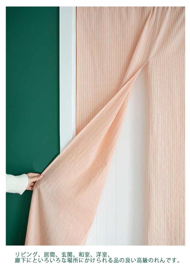 | 可愛いフリンジ付きのれん初登場! キッチンや洗面所の間仕切りにクロゼットや棚の目隠しなどにインテリアの邪魔にならない♪ シンプルな色&ストライプ柄はとてもおしゃれです。 リビング、居間、玄関、和室、洋室、廊下にといろいろな場所にかけられる品の良い高級のれんです。 目隠し能力もしっかりしております。オールシーズンには向けますのれんです。 玄関と今の開き戸のところに使用がいいです。やわらかい色で風が外から入ってくると、いい感じにゆれて癒されます。 洗濯機で丸洗いOK。 | |