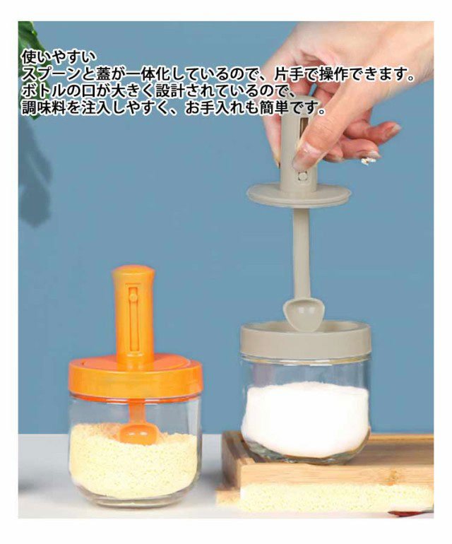| 【調味料入れ】【3個セット】【伸縮可能スプーン付き】 ★安全安心 ボトル本体:ガラス、蓋:PP、シリコン。食品グレードの健康的で環境に優しい素材が使用されています。 ★使いやすい スプーンと蓋が一体化しているので、片手で操作できます。ボトルの口が大きく設計されているので、調味料を注入しやすく、お手入れも簡単です。 ★整理整頓 調味料を簡単に入れるだけで、キッチンが整然としています。シンプルなデザインで、調理スベースも食卓も選ばず、キッチンに統一感を出してすっきり下印象を与えられます。 ★長さ調節可能 小さじの柄尻は長さ調節可能なので、一番下まで届きますので調味料を使い切ることができて使いやすいです。 また、フタと小さじが一体化しますから、使用中蓋が急に閉じることが心配いりません。 ★密閉 調味料の蓋はシリコンゴム製のパッキンを採用して設計されており、湿気が入るのを防いでくれるので固まりやすい調味料の鮮度を保てます。密閉性に優れ、塩や砂糖などの調味料を長時間放置しても凝固しません。 ★幅広い用途 調味料ボトル、塩、コショウ、砂糖、生姜、シナモン、黄キャベツ、ニンジンなどのスパイスやパウダーケーキとして使用できます。ご家庭やレストランに最適です。 | |