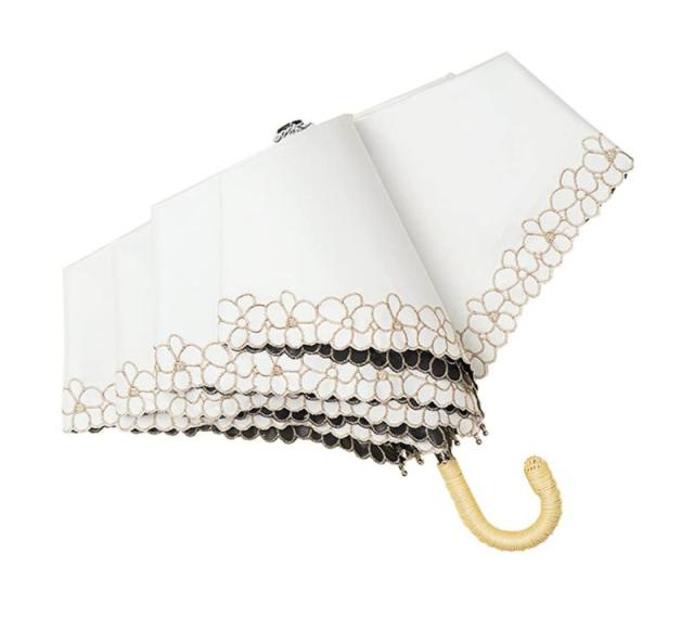 hiino kano 超軽量 日傘 おりたたみ傘 レディース 約173g/193g uvカット 完全遮光/遮熱 晴雨兼用傘 植物ラタン製 アルミ製 J型ハンドル かわいい 日傘兼用雨傘 高密生地 超撥水 耐風 携帯便利 プレゼント (花柄刺繍・ホワイト)