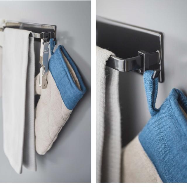マグネットがつくスチール壁面に簡単に取り付けできるワイドサイズのタオルハンガー。シンプルで無駄のないフォルム。目立たず、キッチンに馴染むデザイン。