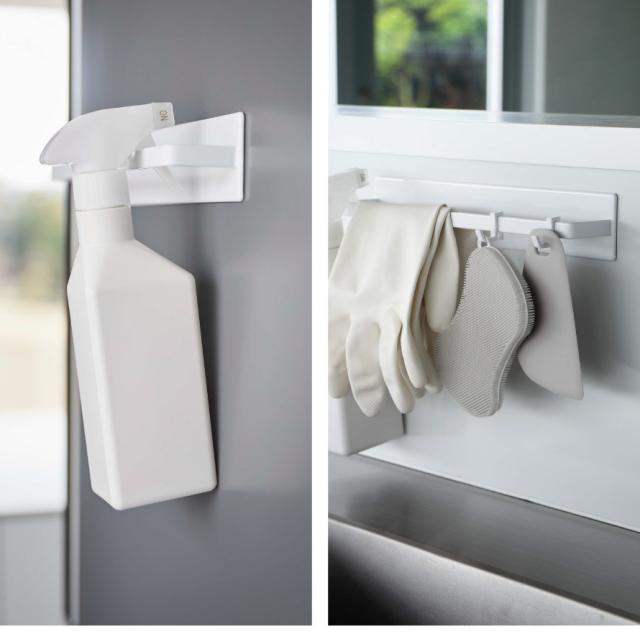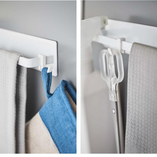 幅が28cmとワイドなので、大きめのタオルが掛けられて便利。スプレー・スポンジ・スクレーパー・ゴム手袋などの掃除道具の収納や布巾・鍋蓋などの収納にも。