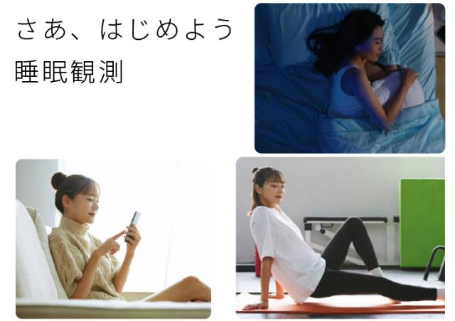 睡眠時間が長ければいい、は不正解です。睡眠の時の、呼吸、いびき、寝返り回数など、睡眠はたくさんの要素から成り立っています。朝起きたら“寝ているだけで”記録される睡眠スコアをアプリでチェックしましょう。毎日の眠りだけでなく、月ごとのスコア推移と比較したり、過去の傾向を振り返ることで、健康管理にもつながります。スマホ画面