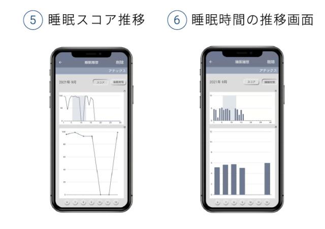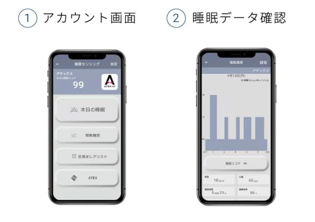 ?アカウント画面・・・まずは総合スコアを確認しましょう?睡眠データ確認・・・眠りの状態をグラフでチェック、呼吸や寝返り回数なども詳細にリポート