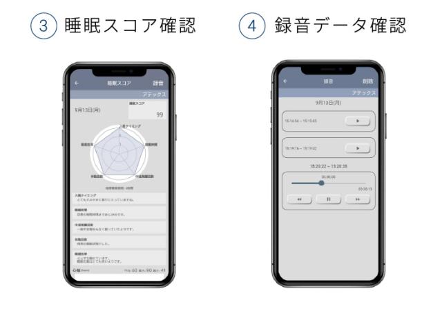 ?睡眠スコア確認・・・スコアの内容をレーダーチャートで?録音データ確認・・・いびきや寝言をセルフチェック
