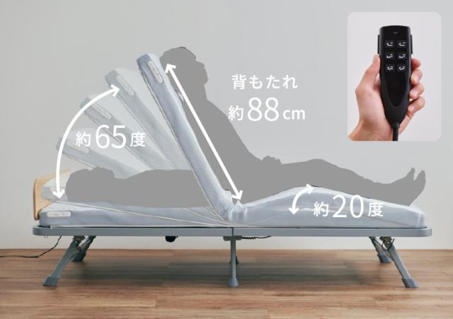 手元ボタンによる操作で、背もたれは65度、足元は20度まで調整できる電動リクライニング式。背もたれ・足元がそれぞれ独立して動く2モータータイプだから、体調やシーンに合わせて心地よいポジションを創出します。