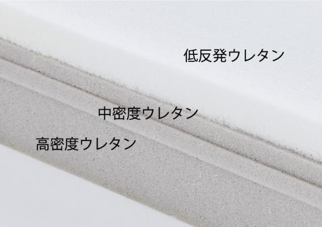 ソフトタッチの軟質ウレタン(厚さ2cm)、弾力性のある中密度ウレタン(厚さ2cm)、カラダを支える高密度ウレタン(厚さ4cm)を重ねた三重構造のマットレス。カラダにかかる圧力を分散し、睡眠中の肩や腰への負担を大幅に軽減します。