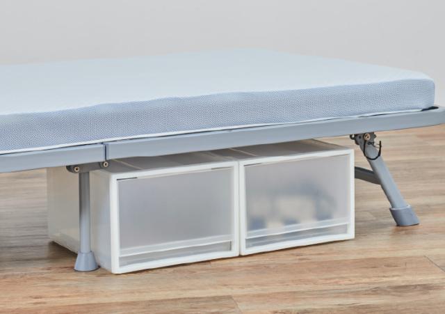 高さ27cm、幅45cm、奥行き45cmの収納ボックスを3つ置くことができる収納スペースを確保。ベッド下に空間があるので、ロボット掃除機が通りやすく、清潔な状態をキープできます。