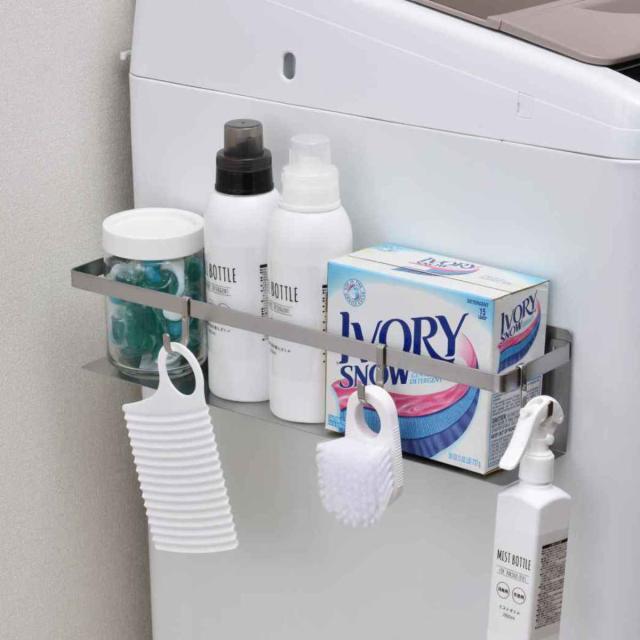 洗濯機に直接貼り付けられるマグネットの収納ラック、ロングタイプです。洗濯洗剤や、柔軟剤などの置き場所に最適で、使いたいときにサッと取れるので大変便利です。3個のフック付きなので引っ掛け収納もできます。洗濯機サイド、前面はもちろん、冷蔵庫などでも使用可能です。