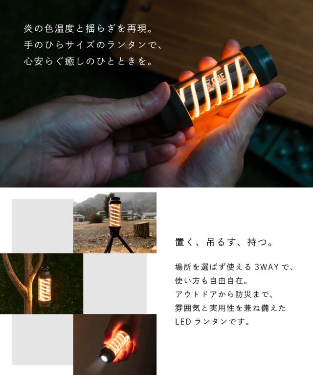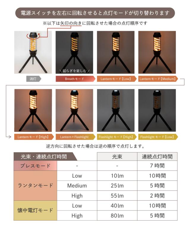 炎の色温度と揺らぎをLEDで再現。炎のゆらぎを再現する"Breathモード"、灯りとして適した"Lanternモード"、懐中電灯として使用できる便利な"Flashlightモード"を切り替えてご使用できます。