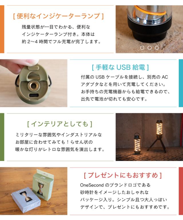 【灯のゆらめきに癒される】 ワンセカンド LEDランタン 調光 3WAY 防災用品 懐中電灯機能 生活防水IPX6対応 小型 軽量 USB充電式 キャンプランタン 雰囲気作り ブラック オリーブ グレー カーキ 黒 緑 ONE SECOND