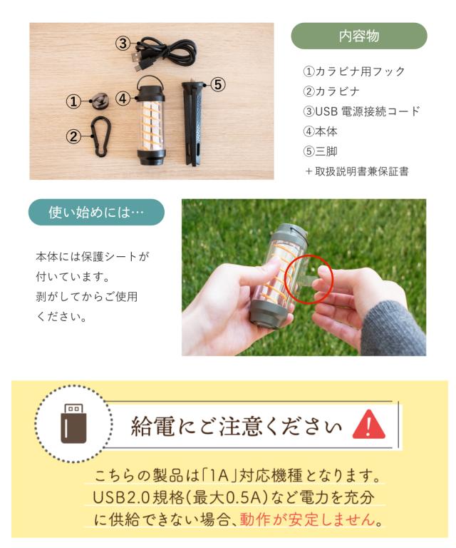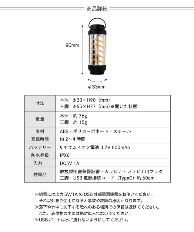 【付属品】取扱説明書兼保証書・カラビナ・カラビナ用フック・三脚・USB電源接続コード(TypeC)約60cm