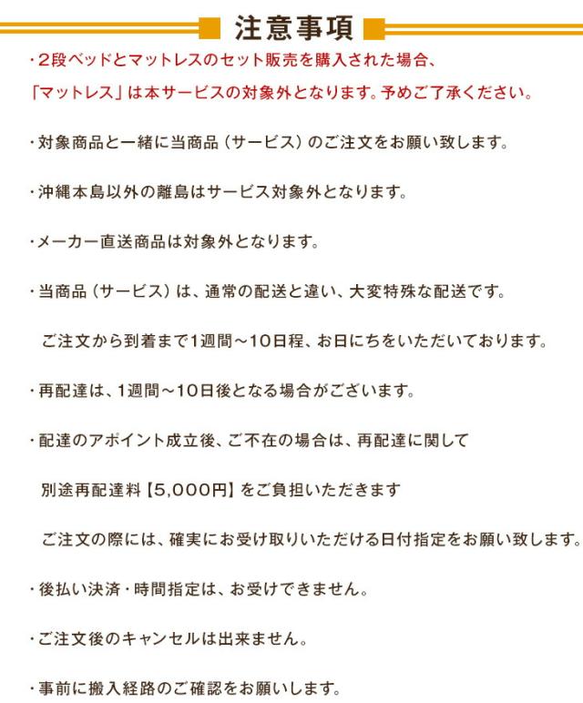 【2段ベッド(引出し・階段なし)専用】 組立・開梱設置サービス 【超大型】【後払/時間指定NG】【沖縄本島以外の離島は対象外】 搬入設置サービス 搬入設置 搬入 設置 組み立て 組立