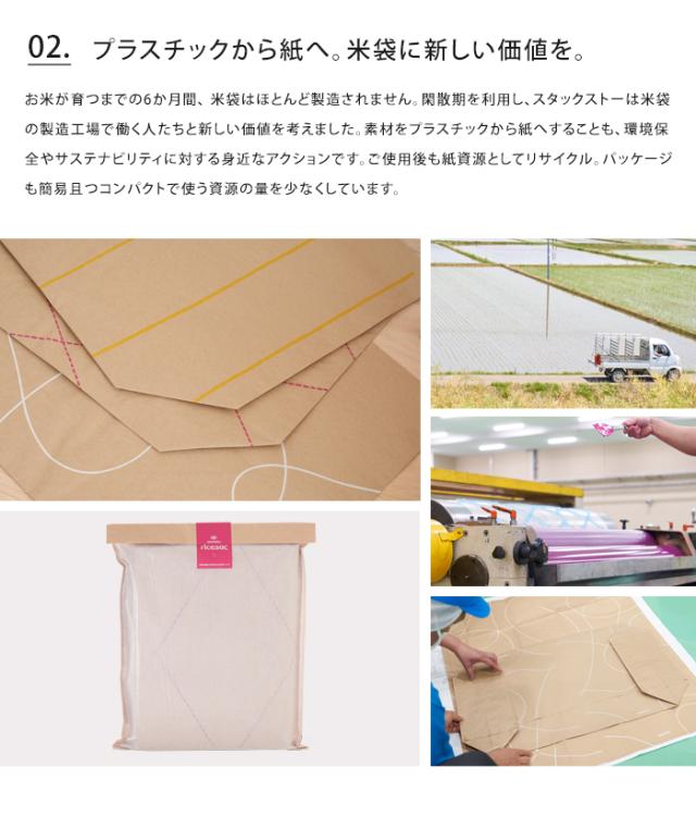 米袋は扱う人の安全や作業性を考えて国の基準で厳しく管理されており、特殊な紙の3層構造でできています。水に強く、高強度、軽くて、防湿性、通気性もあるなどの機能性を活かしながら、紙素材100%特有のカジュアルな魅力を引き出しました。 植栽のカバーや、汚れた衣類、生活感が出てしまう場所の目隠しなど、用途や置き場所を選ばず使えて、空間にリラックスした抜け感を生み出します。お米が育つまでの6か月間、 米袋はほとんど製造されません。閑散期を利用し、スタックストーは米袋の製造工場で働く人たちと新しい価値を考えました。素材をプラスチックから紙へすることも、環境保全やサステナビリティに対する身近なアクションです。ご使用後も紙資源としてリサイクル。パッケージも簡易且つコンパクトで使う資源の量を少なくしています。