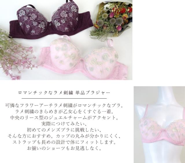 可憐なフラワーアーチラメ刺繍がロマンチックなブラ。ラメ刺繍のきらめきが乙女心をくすぐる一着。中央のリース型のジュエルチャームがアクセント。実際につけてみたい、初めてのメンズブラに挑戦したい、そんな方におすすめ。カップの丸みが分かりにくく、ストラップも長めの設計で体にフィットします。お揃いのショーツもお見逃しなく。