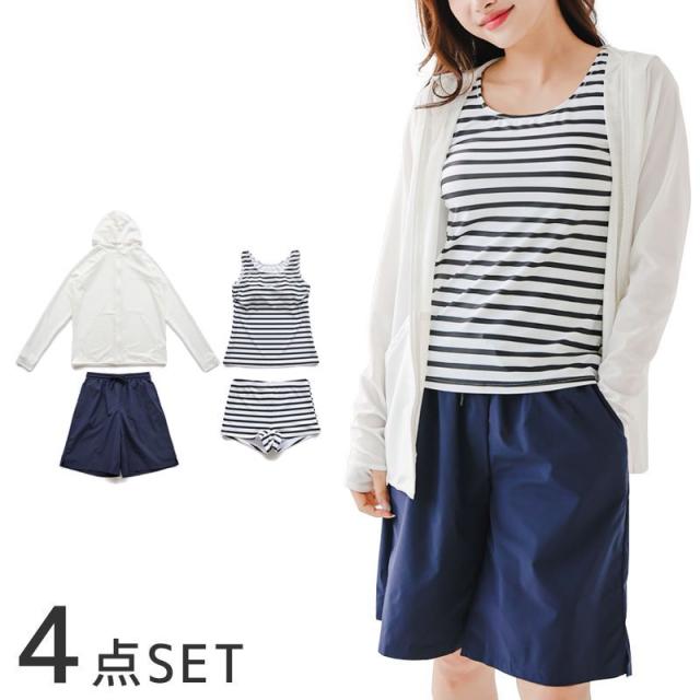 ファスナーつきラッシュガードとショットパンツ、タンキニトップス、四角ショーツがセットになった、プールや海で大活躍の4点セット。
