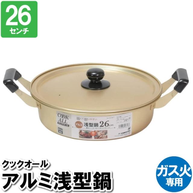 両手鍋 大容量 浅型 鍋 軽量 26cm ガス火 蓋付 アルミ ゴールド 温める 煮込み料理 茹でる 味噌汁 スープ ポトフ ちゃんこ鍋 豆乳鍋