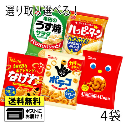 亀田&東ハト よりどり 選べる (4袋)小袋 ポテコ なげわ ハッピーターン うす焼き スナック菓子 おやつ お菓子 おかし 食べ切り メール便