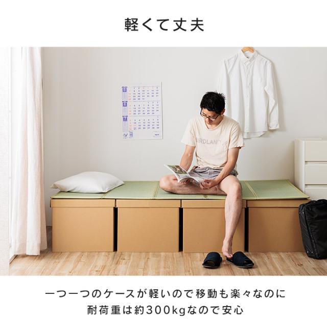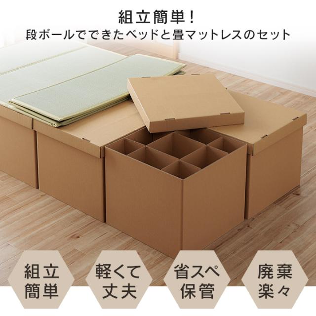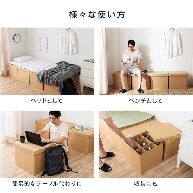 | ■工具不要で組立が簡単な段ボールでできたベッドと畳マットレスのセットです。 ■単身赴任や一人暮らしにおすすめ。 ■日本製の段ボールは軽くて丈夫。一つ一つのケースが軽いので移動も楽々です。 ■ベッドとしてだけではなく、ベンチや簡易的なテーブル代わり、小上がりとしてもお使いいただけます。 ■蓋を開ければ小物も収納可能。 ■省スペースに保管が可能なので、来客用ベッドとしても。 ■引っ越しする時にも簡単に解体できて、コンパクトにまとめて持ち運ぶことができます。 ■段ボールは資源ごみとして処分が可能なので、不要になったときはコンパクトに畳んで処分するだけ。 ■災害時の簡易ベッドとして避難所等でもお使いいただけます。 |