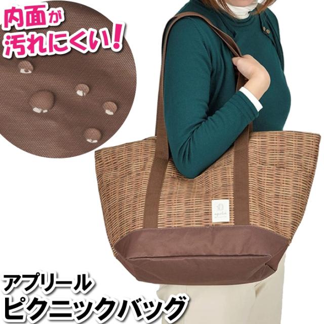 トート カバン おしゃれ ブラウン カゴバッグ風 プリント ラタン バッグ 夏 ピクニック 遠足 肩掛け