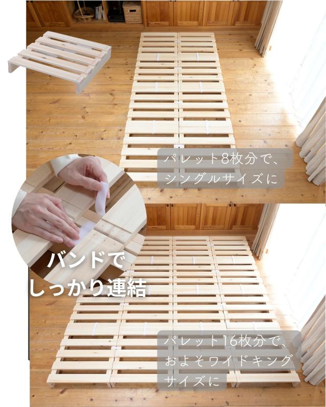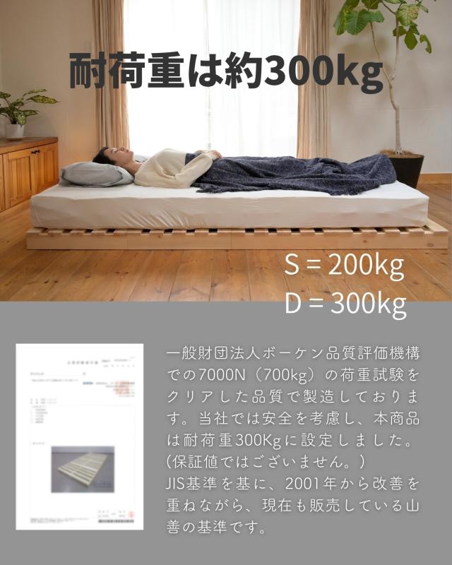 | 商品説明 | ●低いベッドをお探しの方へおすすめなロータイプベッドフレーム ●パレットのように組み合わせて使う、木製すのこのローベッド ●バラバラにしても並べるだけなので、模様替えや引越しに嬉しい完成品 ●素材はパイン材、燻蒸処理をして、死に節を除外する選定基準で安全に配慮した設計(無塗装) ※研磨や面取り処理は行っていますが、ザラつきが残る場合があります ●角度は丸みをつけたやさしいデザイン ●すのこ1枚あたり約2kg ●床への接地面はすべて脚にフェルト貼り付け ●8枚でおよそシングルサイズ、1枚ずつは付属のバンドでしっかり連結することも可能 ●さらに追加すると、ダブルサイズにできたりハイタイプにできたり、使い方のアレンジ可能 ●静止耐荷重は、 8枚をシングルベッド利用時で200kg 12枚をダブルベッド利用時で300kg (耐荷重は、保証値ではございません。) 本製品は最大荷重試験の7000N(約700Kg)をクリアした商品です。 当社では安全を考慮し、本商品はシングルベッド利用時は耐荷重200Kg、ダブルベッド利用時は耐荷重300kgに設定しております。 ●しっかりしたつくりなので、組み合わせを変えてベンチのように使うことも可能 ●パレット1枚あたりサイズ: 幅49cm 奥行49cm 高さ9cm、重量1.8kg ●すのこ板が5枚、すのこ板厚み1.5cm、すのこ隙間約4cm ●連結用バンド(面テープ) 計16本付属 ※2023年12月 1日より耐荷重表記について見直しを行いました。 |
