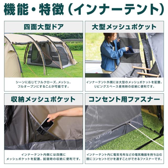 VASTLAND トンネルテント Mサイズ 5人用 ファミリーテント シェルターテント 前室 キャノピー サイドドア連結ファスナー メッシュドア スカート付き