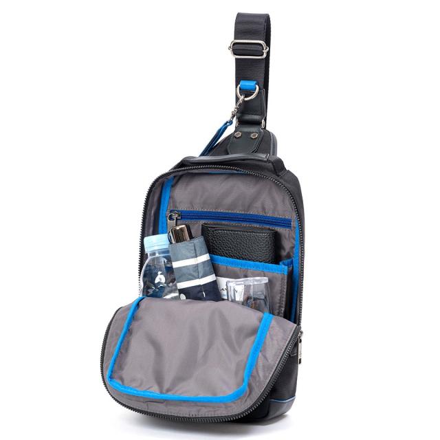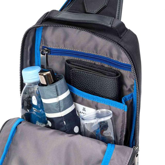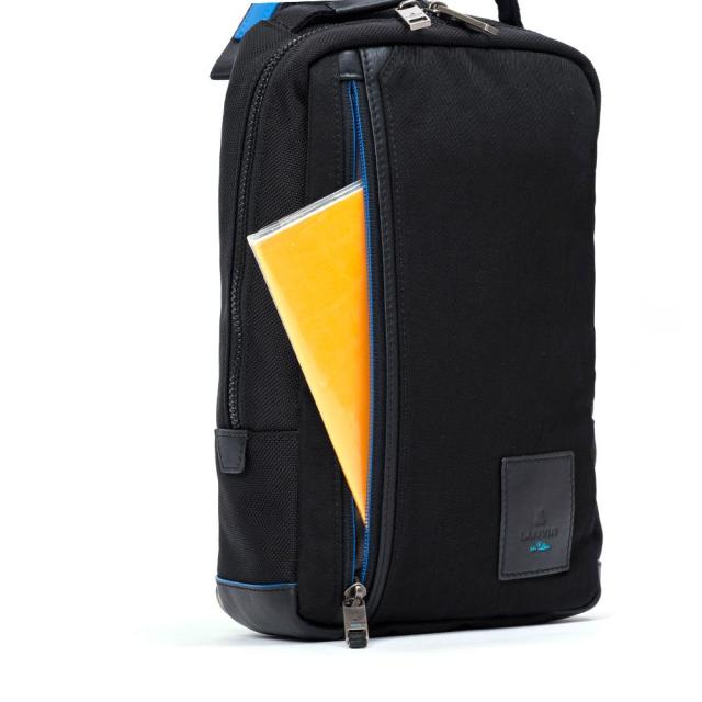 本体素材には弱撥水加工を施したシワナイロンツイルを使用し、負荷の掛かるマチ部分には強度面にも優れたバリスティックナイロンを使用。付属には撥水加工を施したスムース牛革を使用することで、メリハリのある異素材MIX仕様に。前面の中央には、細いブルーの色のラインが入ったオリジナル裏使いファスナーを使用し、随所にブルー色パーツを用いてランバンブランドらしさを表現しました。内装は機能的でありながら見た目より軽量に仕上げた事で幅広い年齢層にご使用いただけるタユンユースカジュアルスタイルに仕上げました。