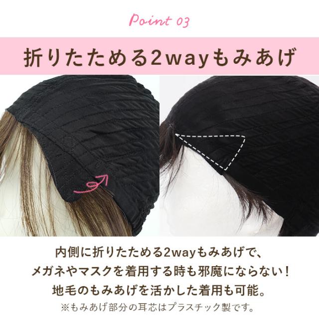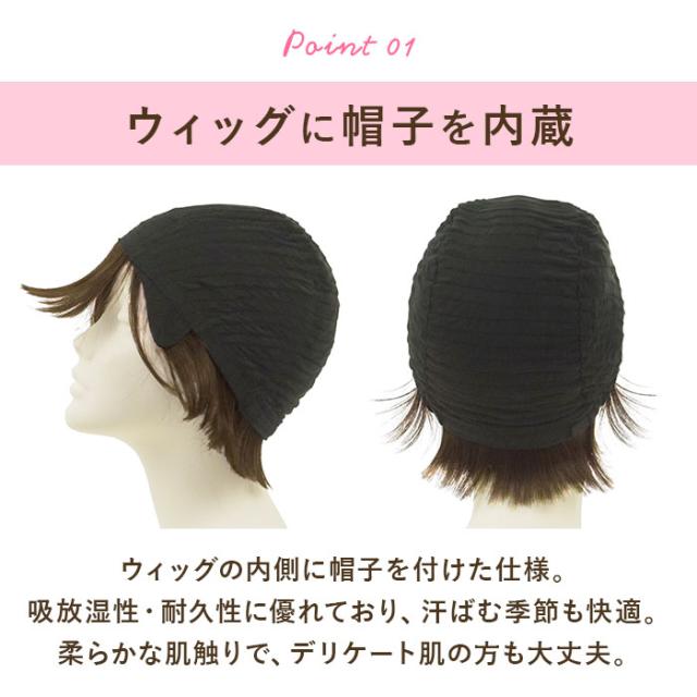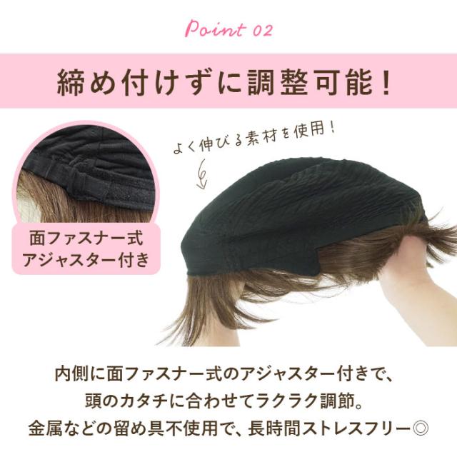 | 商品説明 | ・帽子をかぶるようにウィッグをかぶって、外ハネボブヘアに♪誰でも簡単装着できる、帽子ウィッグが登場。 【憧れのヘアスタイルにチェンジ】 ・メリハリのあるシルエットをつくる、外ハネボブヘアに変身☆ゆったり感のあるサイズで、ちょっとしたお出かけやリラックスタイムにも! 【ウィッグに帽子を内蔵】 ・ウィッグの内側に帽子を付けた仕様。伸縮性に優れているから締めつけ感を感じにくく、長時間の着用もストレスフリー◎ 【キャップは天然素材】 ・キャップには土に還るエコ素材を採用。吸放湿性・耐久性に優れており、汗ばむ季節も快適。柔らかな肌触りで、デリケート肌の方も大丈夫。 【着脱がカンタン】 ・内側の帽子を持ってウィッグをかぶり、自分のこめかみやつむじの位置と合わせてスタイリングするだけ。ロングヘアの方は、付属のオールウィッグネットを使用。 【自分サイズにフィット】 ・内側に面ファスナー式のアジャスター付きで、頭のカタチに合わせてラクラク調節。金属などの留め具不使用で、頭皮に負担がかからないのもポイント。 【2wayもみあげ】 ・内側に折りたためる2wayもみあげで、メガネやマスクを着用する時も邪魔にならない!地毛がショートヘアの方は、地毛のもみあげを活かした着用も可能。 【自然なつむじ】 ・人工スキン部分は、より本物に近い頭皮の質感を表現!真上から見られても、ウィッグだと気づかれにくく安心。 【ナローミックスファイバー】 ・従来の新ファイバーに細いファイバーをミックス!より人毛に近い質感を再現することで、ウィッグに見えないナチュラルな仕上がりに。 【日本製耐熱ファイバー100%】 ・コテやヘアアイロンの使用もOK。お好みに合わせてアレンジできるのが嬉しい! 【お手入れラクラク】 ・絡みや汚れが気になったら手洗いできるから、いつも清潔。 【ウィッグ初心者さんでも安心】 ・着用ポイントなどが書かれた説明書、持ち運びに便利なクリアポーチが付属。 【使い方いろいろ】 ・おしゃれを楽しむアイテムとしてはもちろん、医療用としても活躍。 |