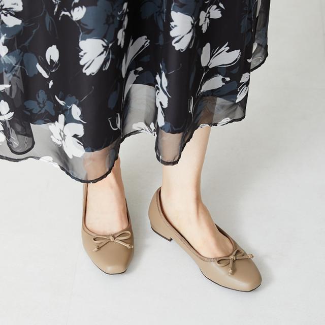 細身のスクエアトゥですっきりとしたシルエットのバレエシューズは、合皮素材のリボンで甘くなり過ぎないよう大人っぽく仕上げた1足。