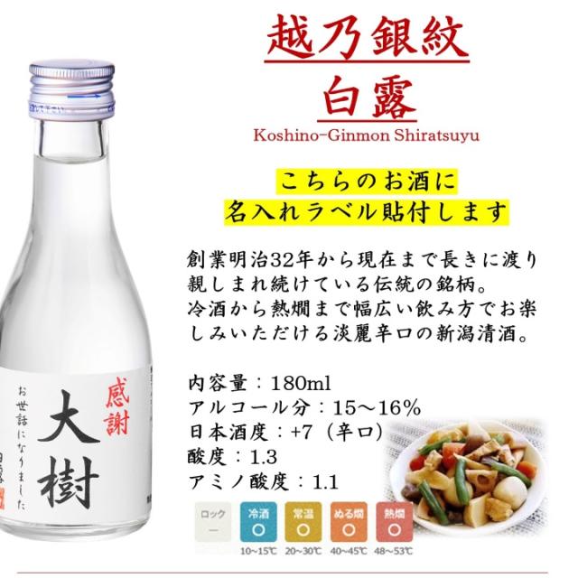 創業明治32年(西暦1899年)、新潟の蔵元、高野酒造が丹精込めて醸し上げた「越乃銀紋 白露 180ml」に世界に一つだけのオリジナルラベルを貼って、白無地の紙箱にお入れしてお届けします。