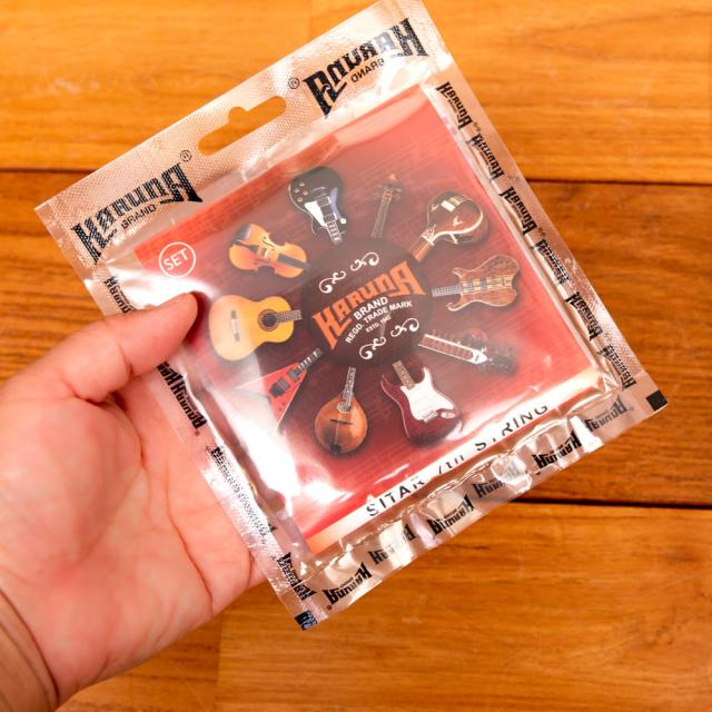 日本では入手が難しいシタールの弦。7本の弦が一回張替えできますシタールの共鳴弦(Tarafdar)は、長めの弦が入っており、切って何本かに分けて使用して頂く形になっております。 ただ、シタールの共鳴弦は何本も数が必要ですので、このセットだけで全部の弦が張り替えられることを保証しておりません。共鳴弦が必要な場合は別途共鳴弦をご購入下さい