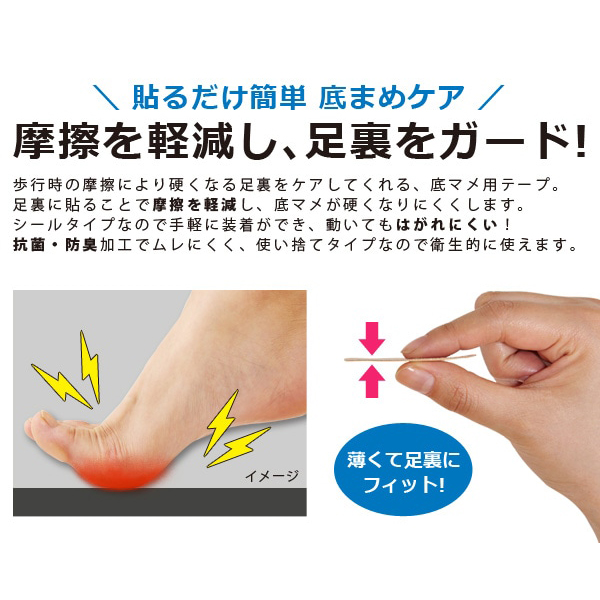 - 注文して直ぐに届きました。底マメが出来て歩くのが辛かったですが、底マメテープのお陰で痛みが軽減されました。無くなる前にまた注文したいと思います。