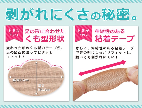 くも型のテープが足の凹凸に沿ってピタっとフィットするので動いても剥がれにくい!