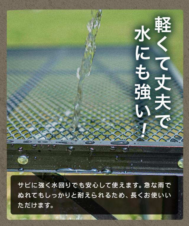 水や熱に強いスチール製のフルメッシュ天板を採用!