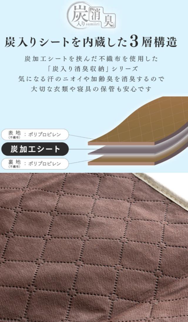 炭加工シートをはさんだ3層構造で、気になる汗のニオイや加齢臭を消臭します。大切な寝具を安心して長期保管できます。