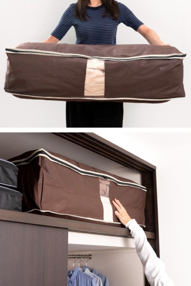 マチがあるのでクローゼットなどに縦置き、横置きどちらでも収納可能です。普段使用しない来客用の布団収納としても役立ちます。