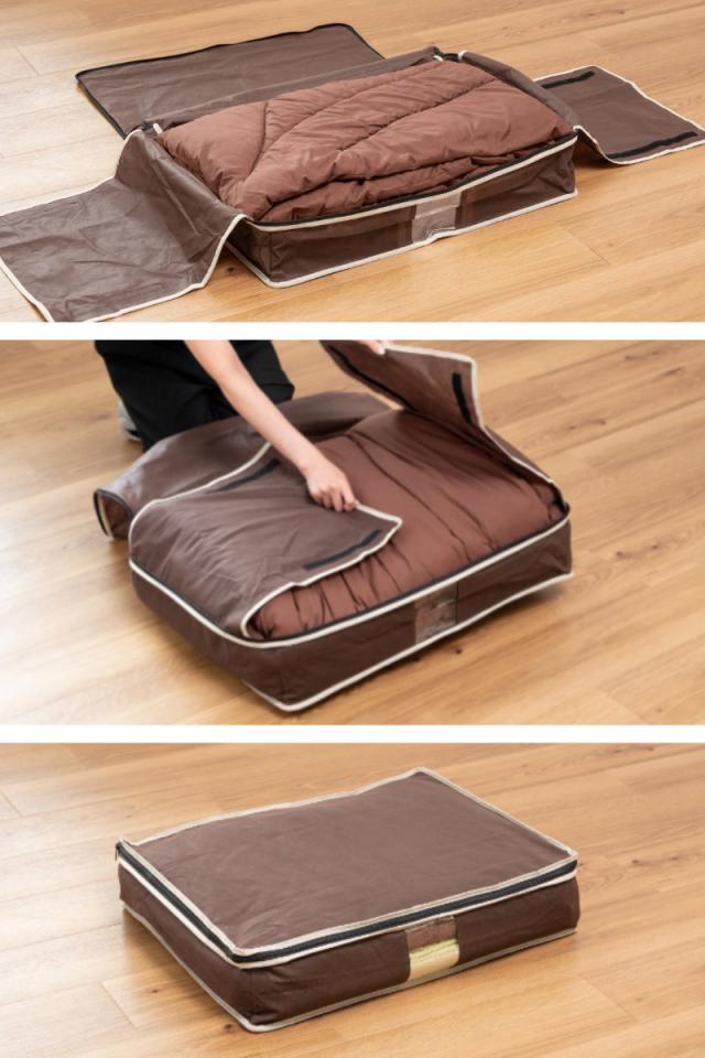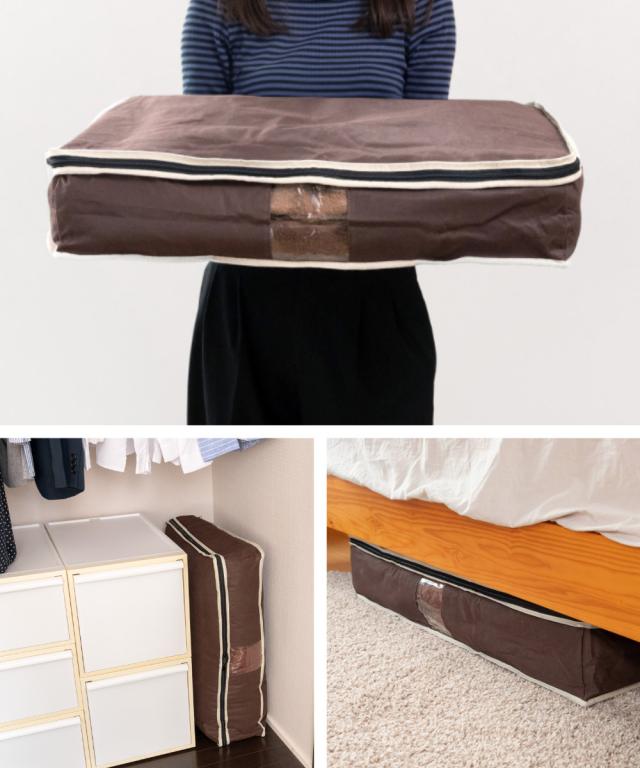 マチがあるのでクローゼットのすき間などに立てて収納できます。ベッド下やソファ下に横置きも可能です。普段使用しない来客用の布団収納としても役立ちます。