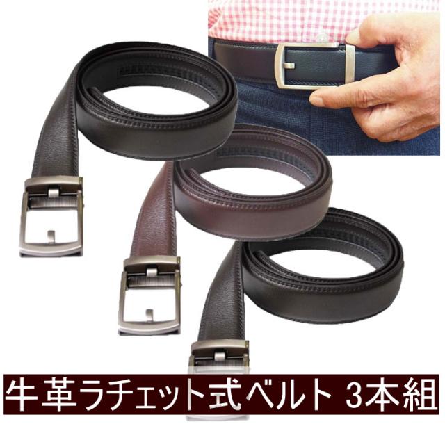 TV通販商品 ファミラ 牛革ラチェット式ベルト2本+1本 合計3本組 長さ調整可能 カラー黒2・茶1 送料無料 穴なし ベルト