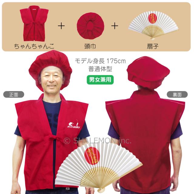 シャレもんオリジナル還暦祝い用ちゃんちゃんこ+頭巾+扇子のセットです。