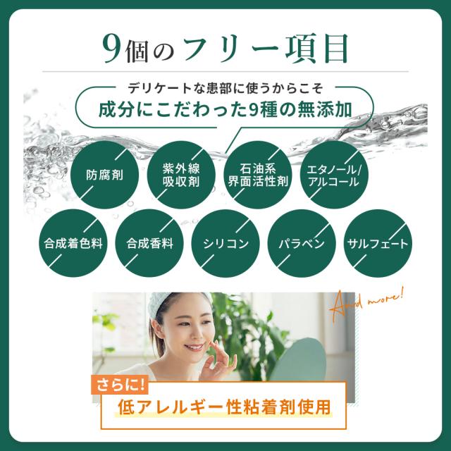 | 成分 | ハイドロコロイド、o-シメン-5-オール、サリチル酸、グリチルリチン酸2K、ティーツリー葉油、トコフェロール、アスコルビルグルコシド、ツボクサ葉/茎エキス、プラセンタ脂質、オリーブ果実油、アロエベラ葉エキス |