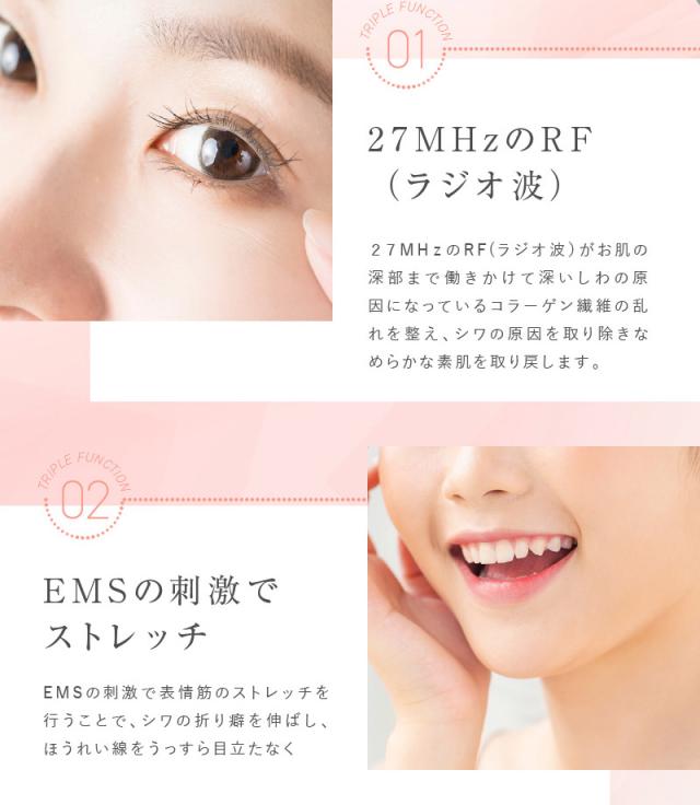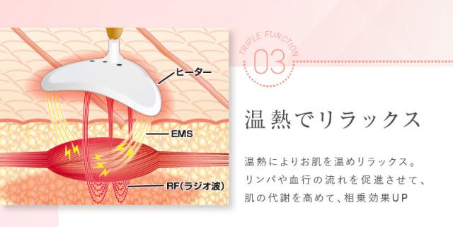 ●深部まで温めるエステで話題のラジオ波と表情筋を鍛えるEMS、表層部を温めるアイロン(ヒーター)の3つの機能の相乗効果でほうれい線、タルミ、スッキリ!