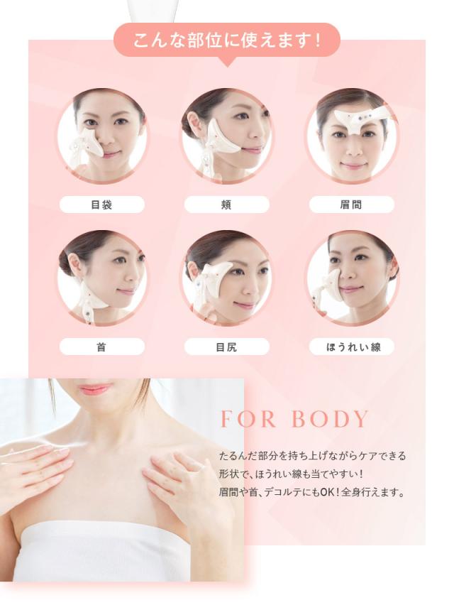 ●たるんだ部分を持ち上げながらケアできる形状で、ほうれい線も当てやすい!眉間や首、デコルテにもOK!全身行えます。